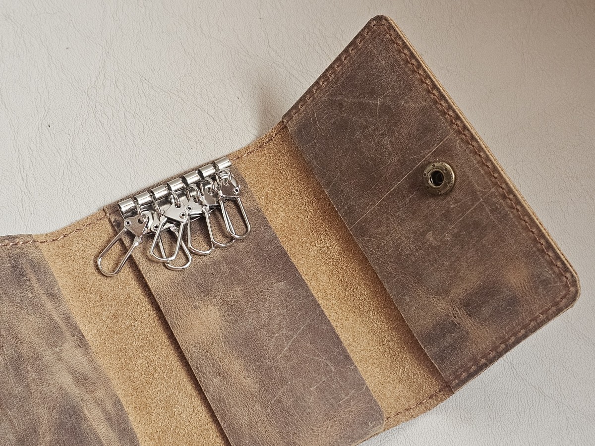 • Dizainas: Užsegama spaude, viduje įmontuoti tvirti karabinai raktams laikyti.