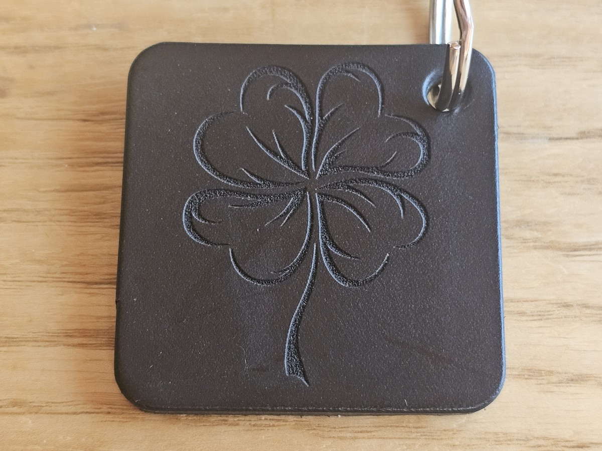 A square leather keychain with an engraved design.