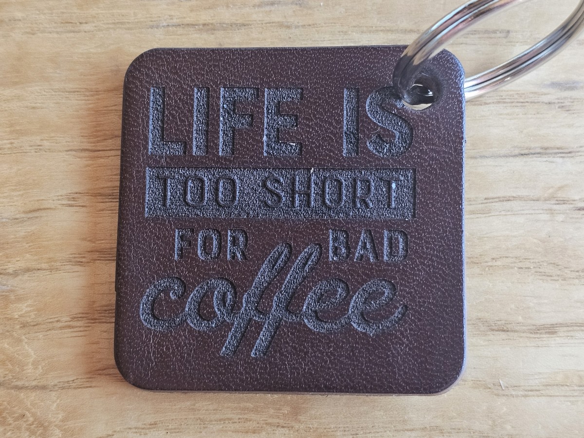 A square leather keychain with an engraved design.