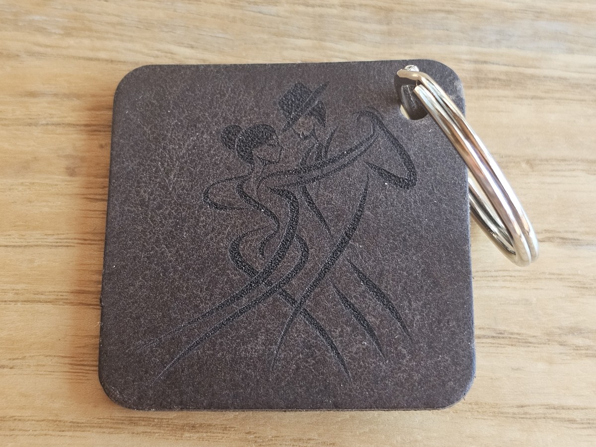 A square leather keychain with an engraved design.