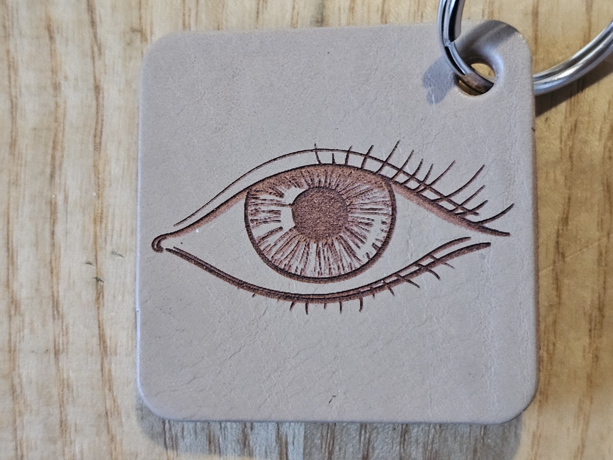 Pagamintas graviruotas raktų pakabukas iš šviesiai rudos natūralios diržinės odos.