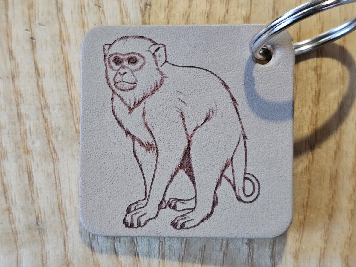 Pagamintas graviruotas raktų pakabukas iš šviesiai rudos natūralios diržinės odos.