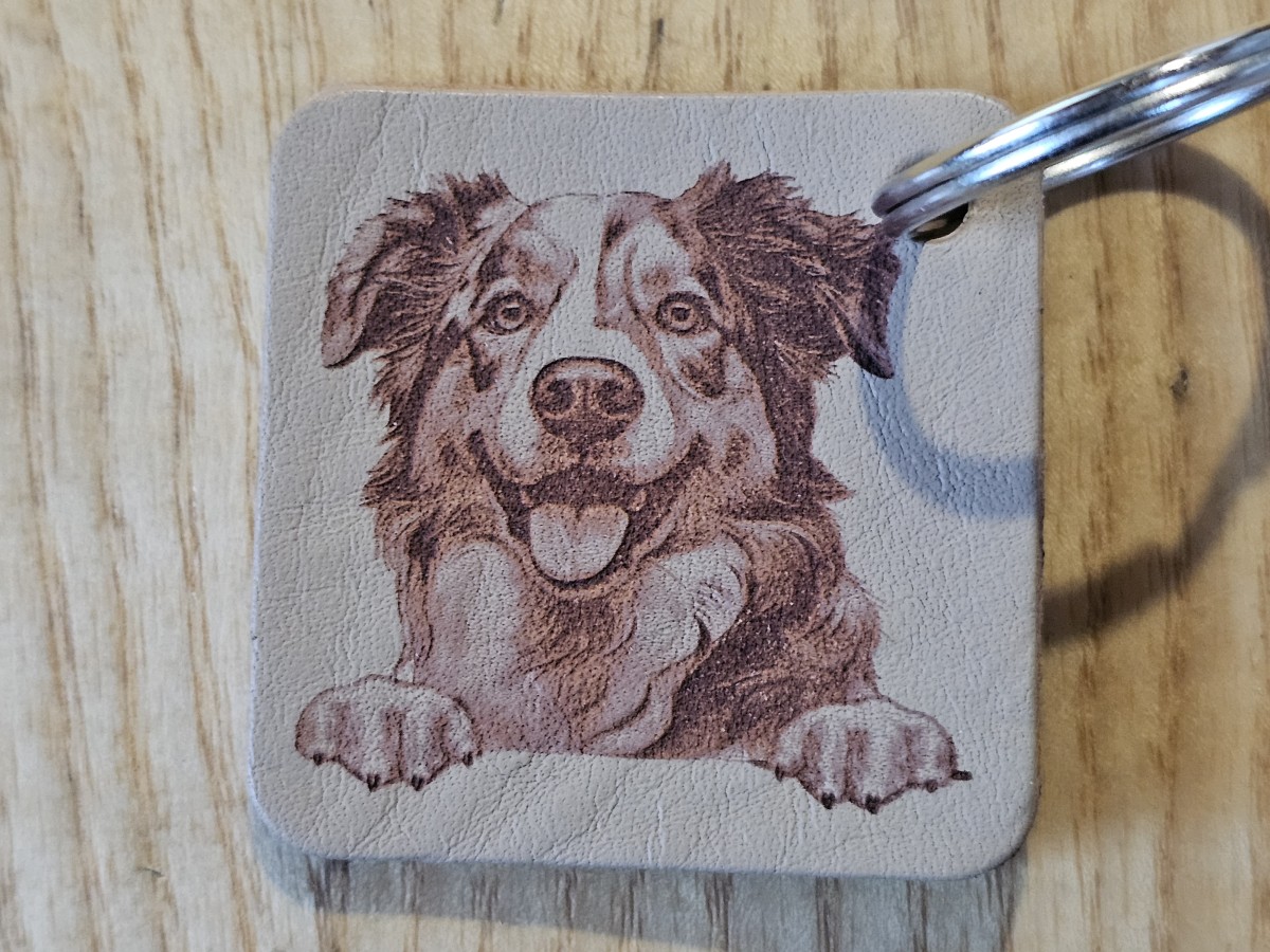 Pagamintas graviruotas raktų pakabukas iš šviesiai rudos natūralios diržinės odos.