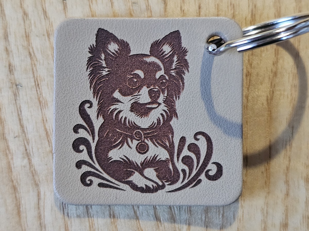 Pagamintas graviruotas raktų pakabukas iš šviesiai rudos natūralios diržinės odos.