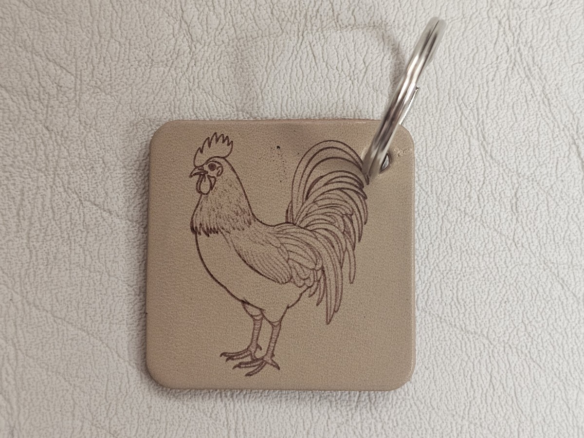 Pagamintas graviruotas raktų pakabukas iš šviesiai rudos natūralios diržinės odos.