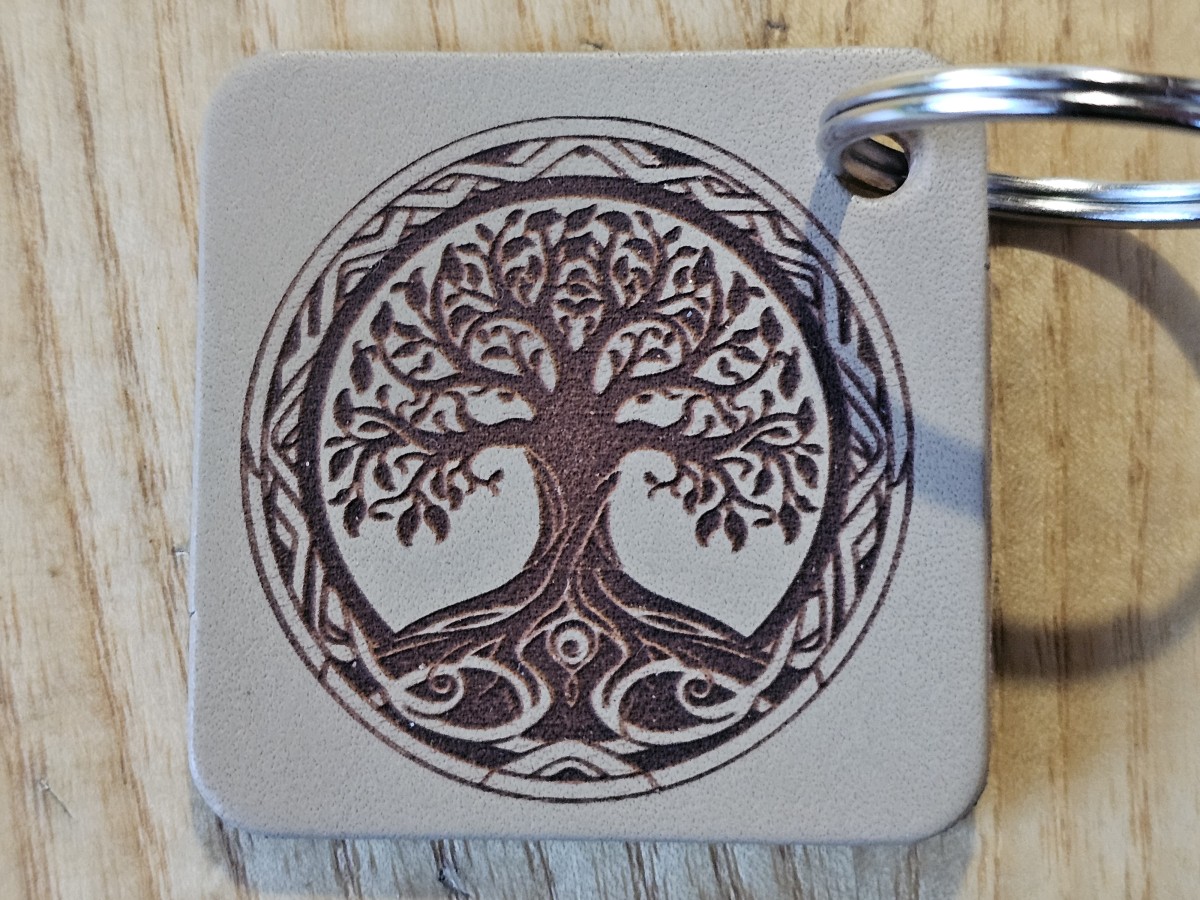 Pagamintas graviruotas raktų pakabukas iš šviesiai rudos natūralios diržinės odos.