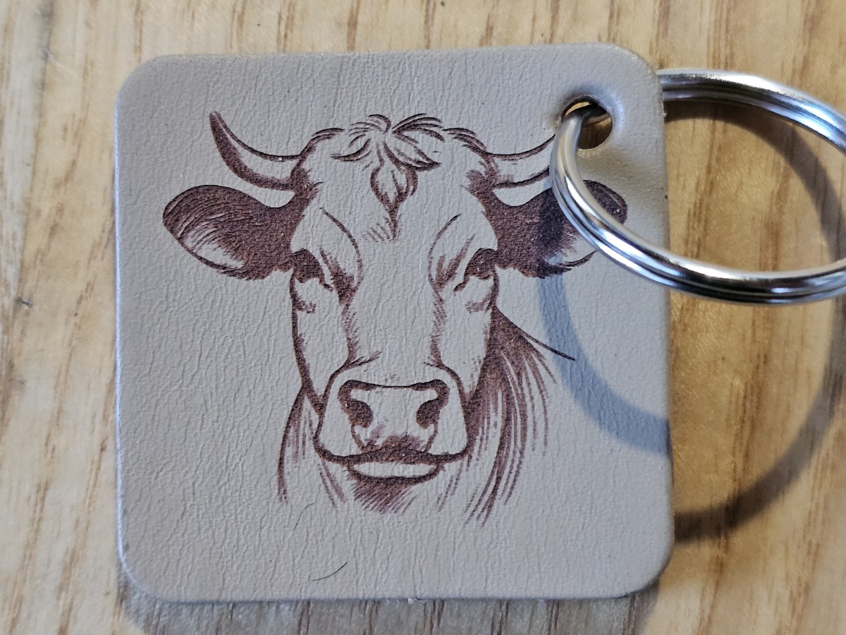 Pagamintas graviruotas raktų pakabukas iš šviesiai rudos natūralios diržinės odos.