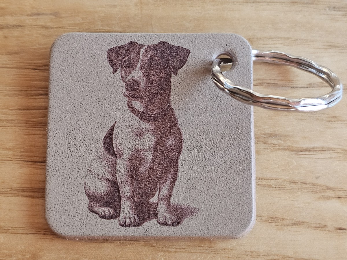 A square leather keychain with an engraved design.