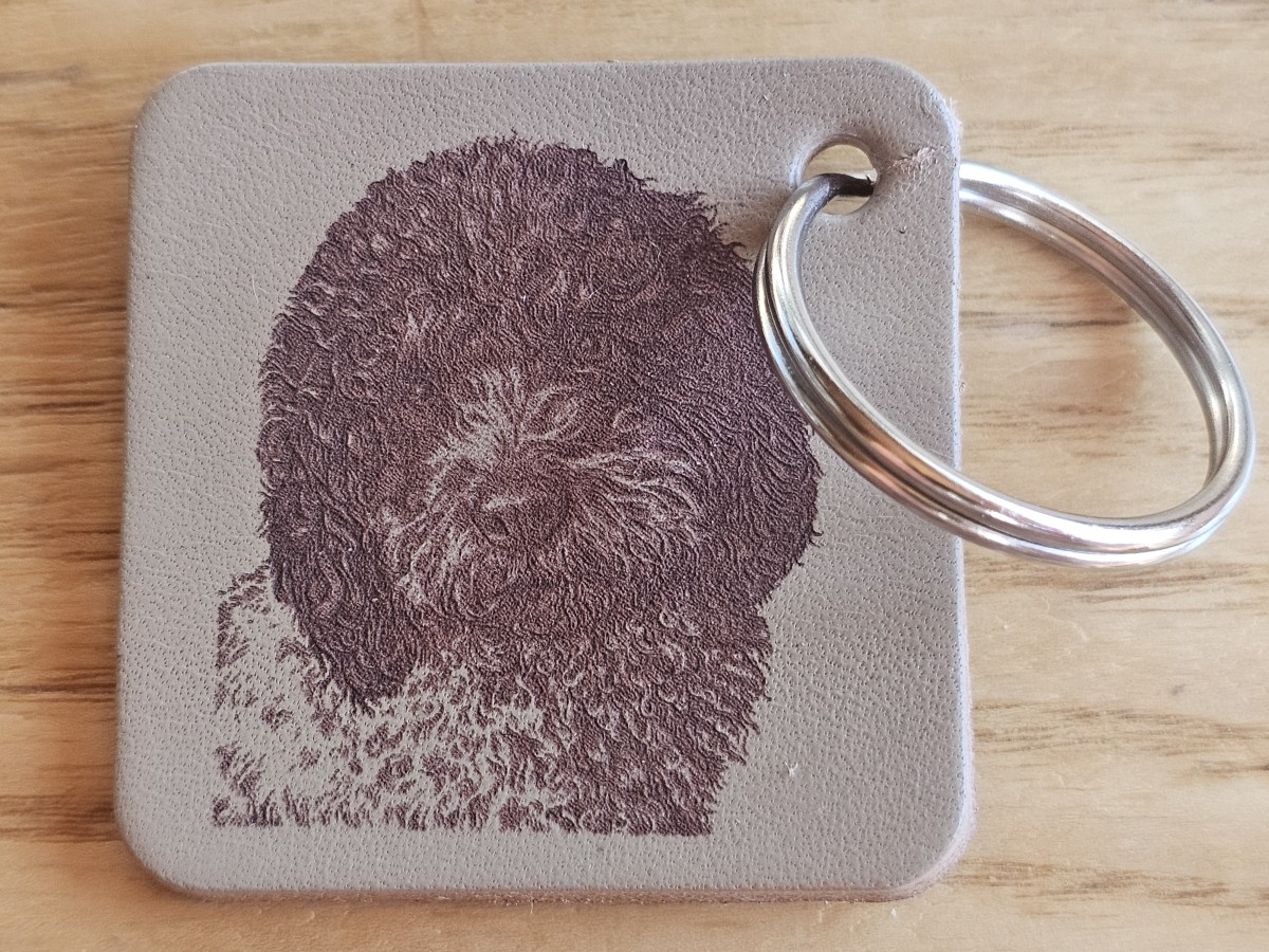 Odinis kvadratinis raktų pakabukas su graviruotu piešiniu.