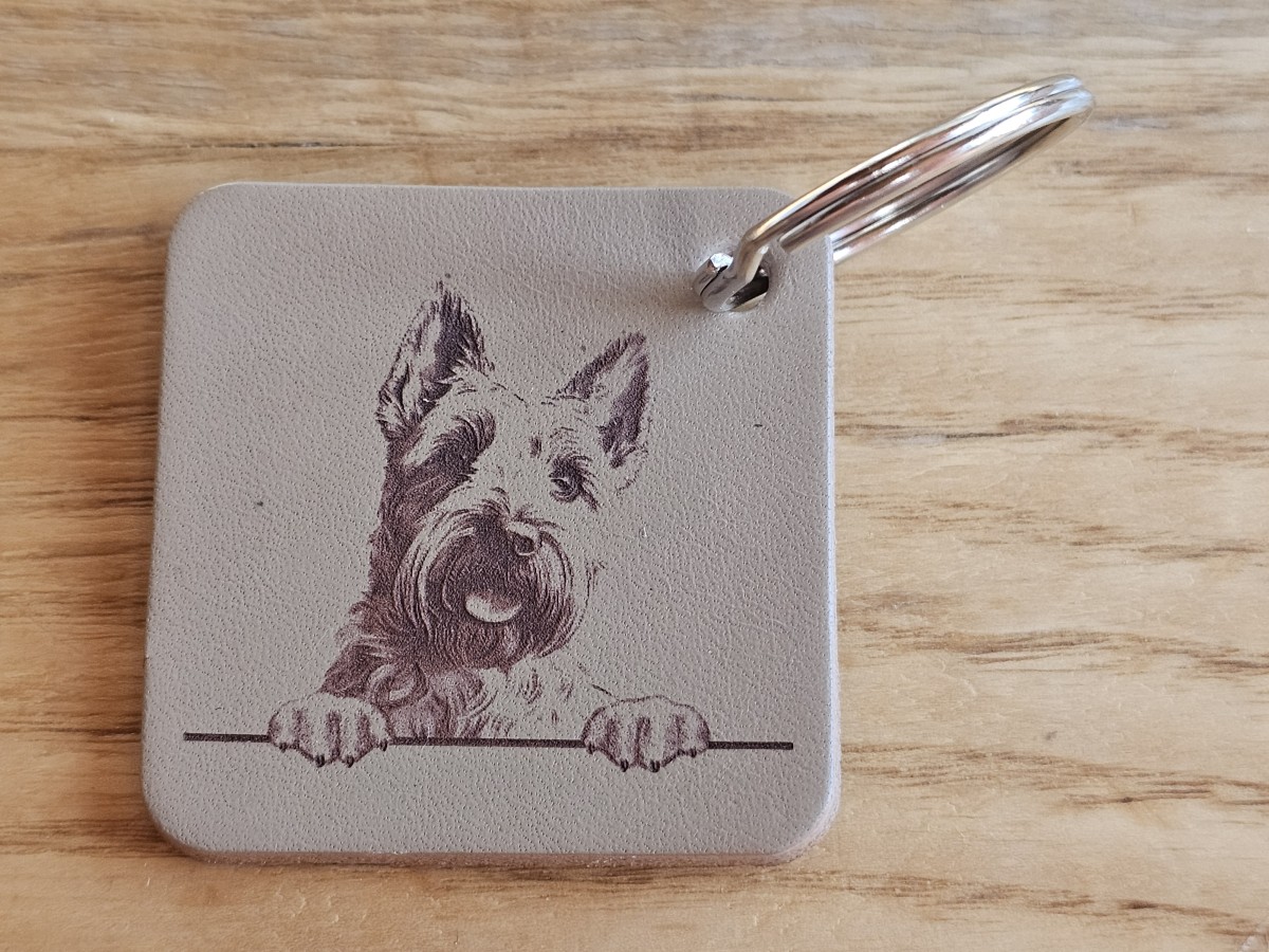 A square leather keychain with an engraved design.