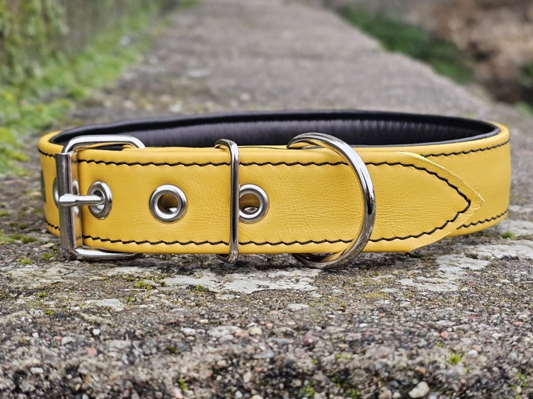 Šio išskirtinio antkaklio gamybai naudojama chrominio išdirbimo geltonos spalvos oda, apačioje juodos spalvos. Antkaklis puikiai tiks šventei, išvykai į miestą ar renginiui.