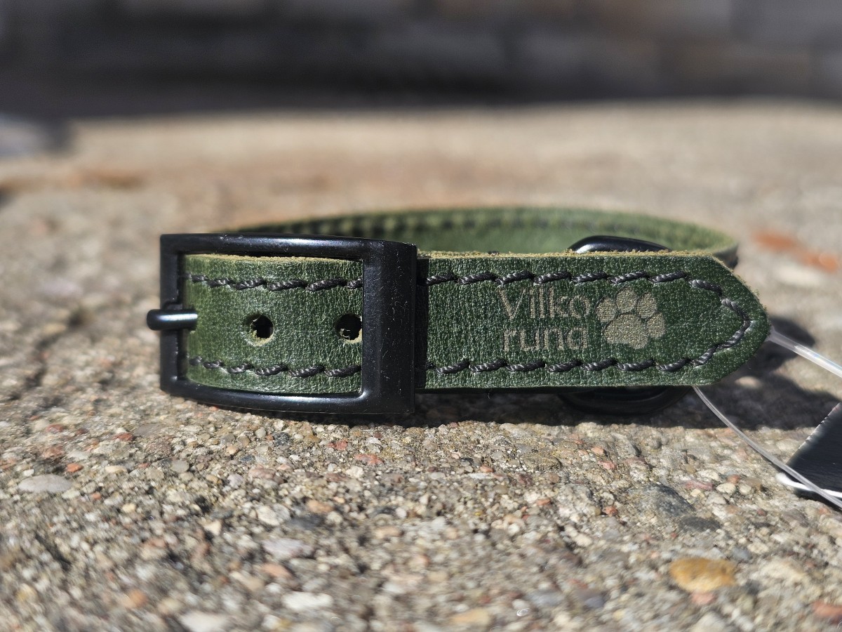 Vienetinis 13 mm pločio mažas sodrios žalios spalvos antkaklis iš plonos augalinio išdirbimo odos.