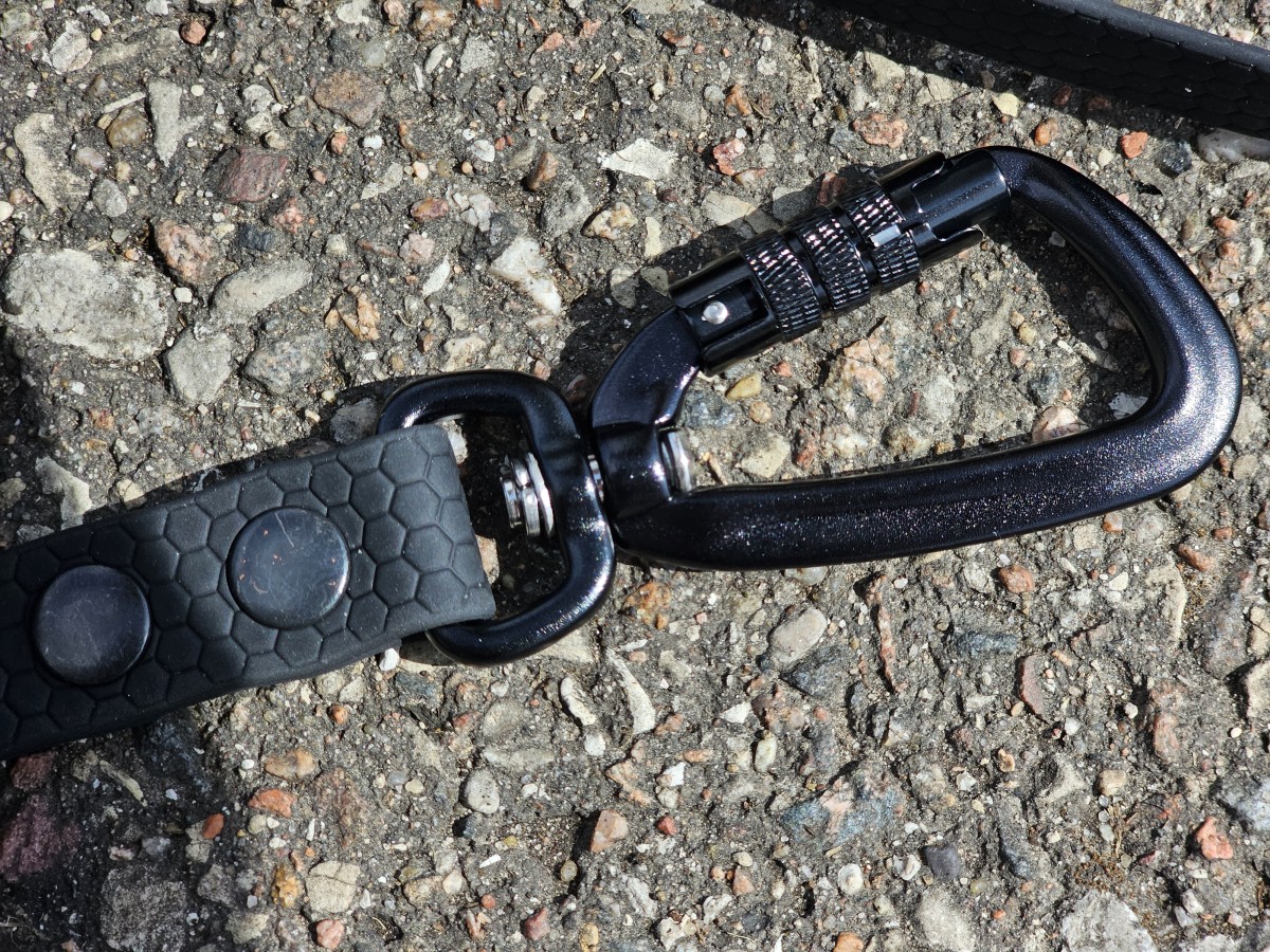 Tvirtas rakinamas aliuminio karabinas, juodos matinės spalvos.
