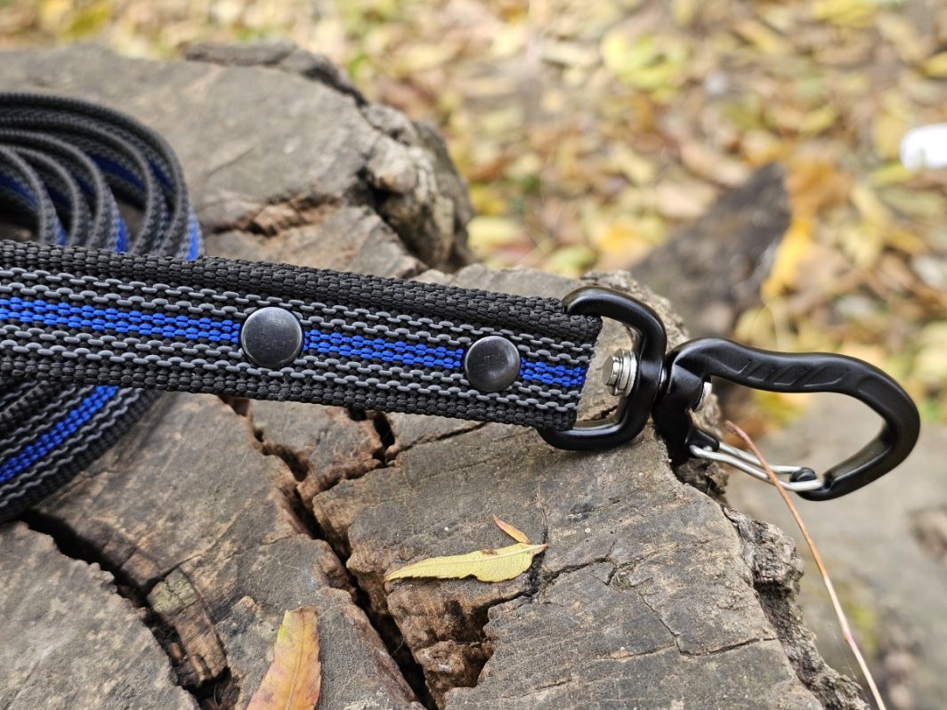 Juodai mėlynos spalvos gumuota juosta derinta su tvirtu aliuminio karabinu.