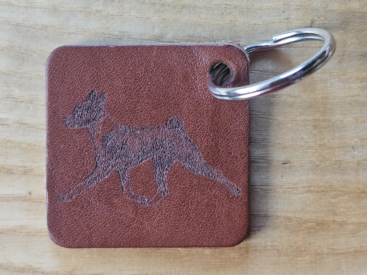 Pagamintas graviruotas raktų pakabukas iš  natūralios diržinės odos.