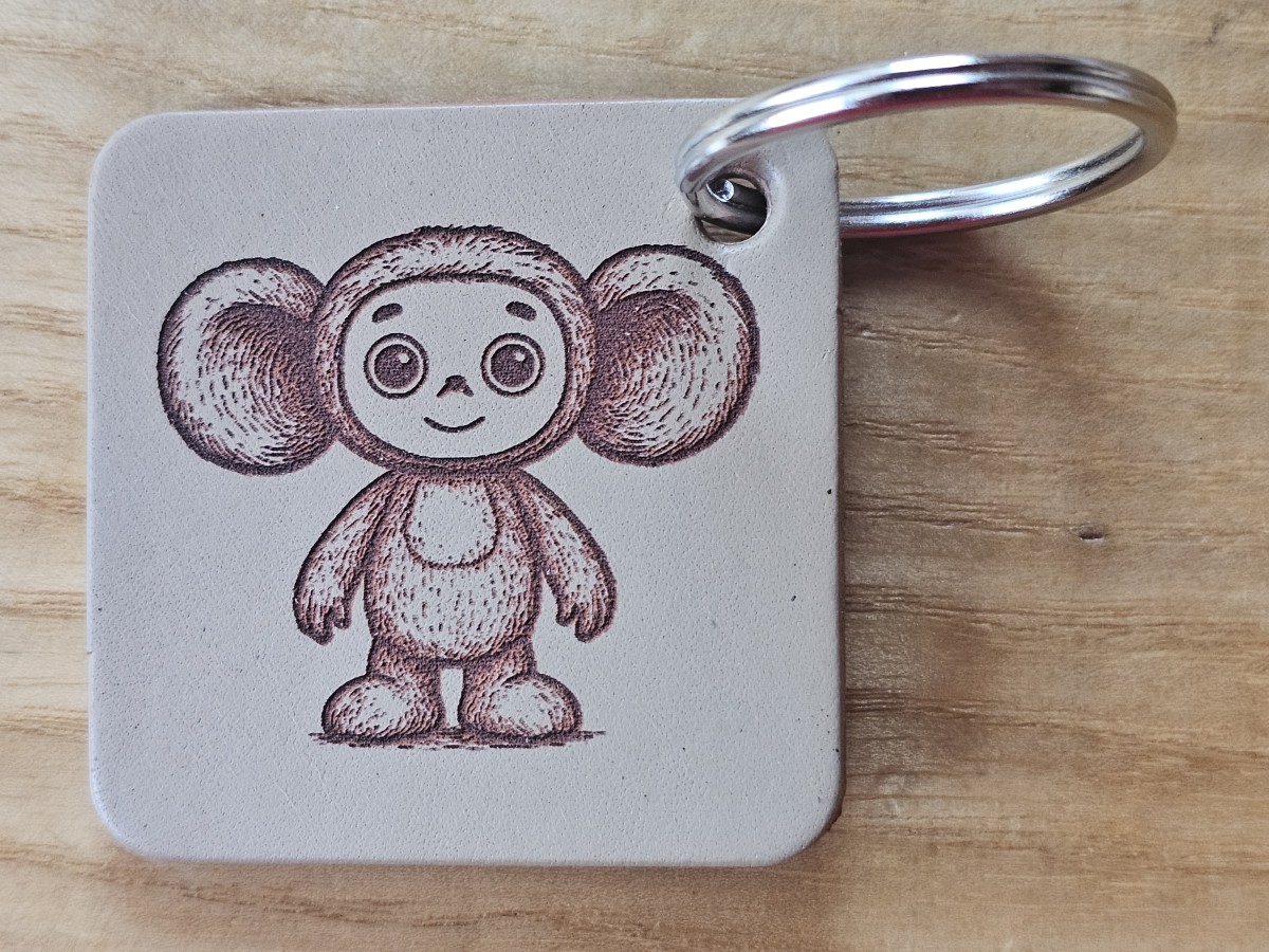 Pagamintas graviruotas raktų pakabukas iš šviesiai rudos natūralios diržinės odos.