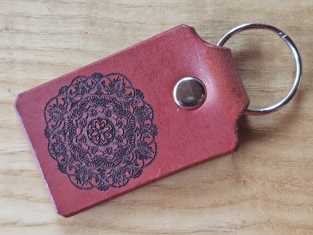 Stilingas ir ilgaamžis raktų pakabukas, pagamintas iš raudonos natūralios diržinės odos.