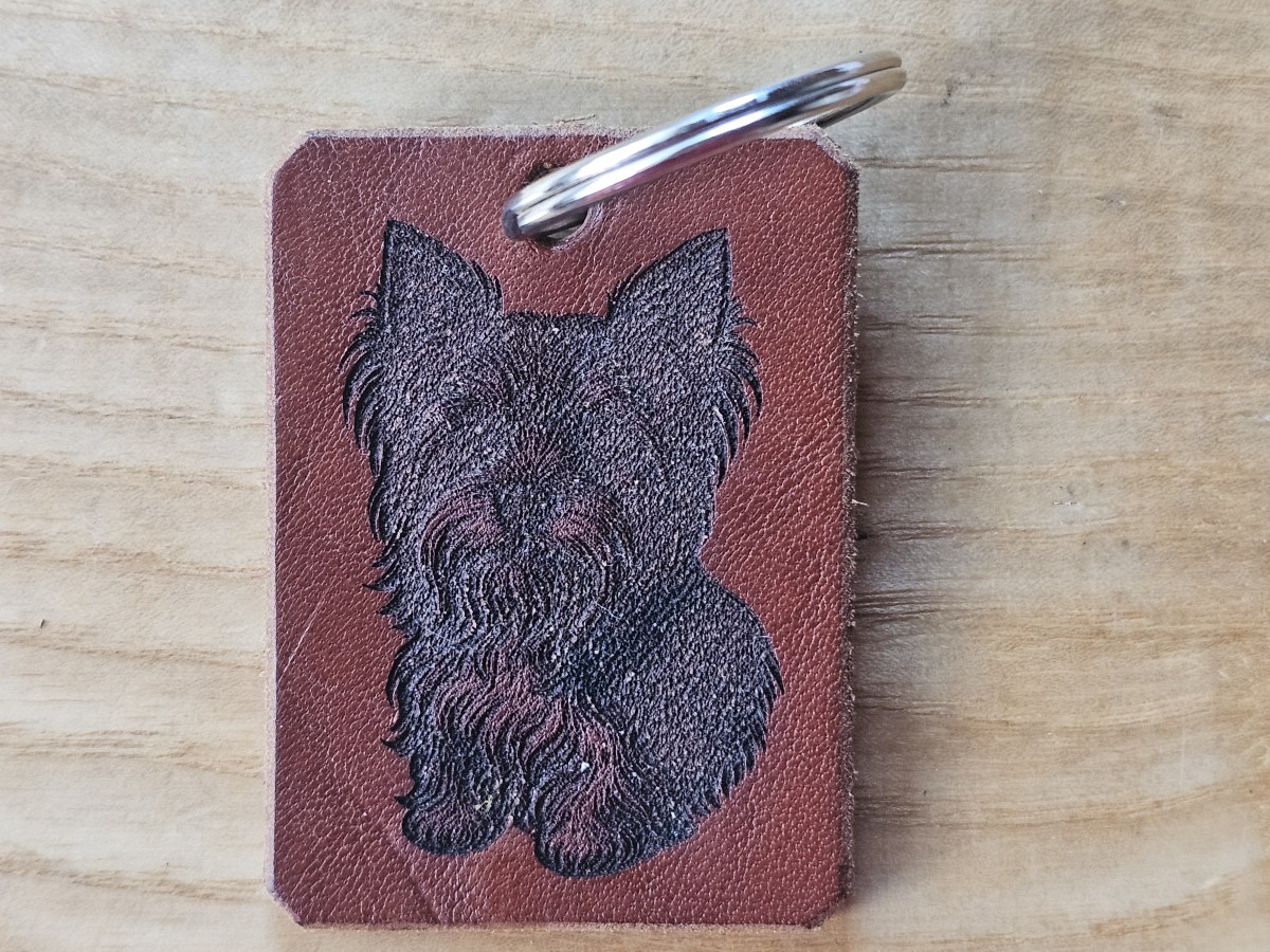 Stilingas ir ilgaamžis raktų pakabukas, pagamintas iš tamsios natūralios diržinės odos. Išgraviruotas sėdintis jorkšyro terjeras.