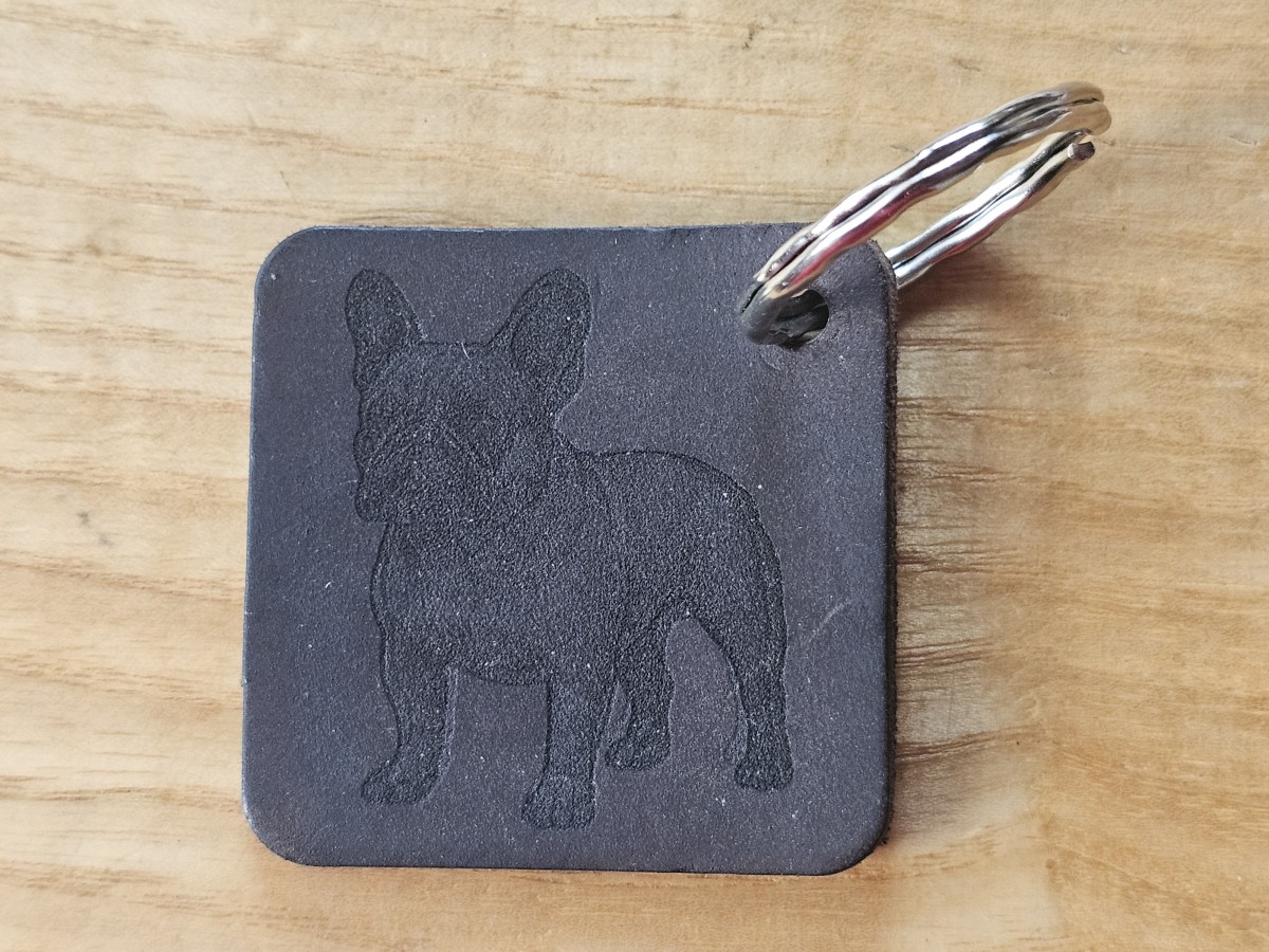 Pagamintas graviruotas raktų pakabukas iš  natūralios diržinės odos.