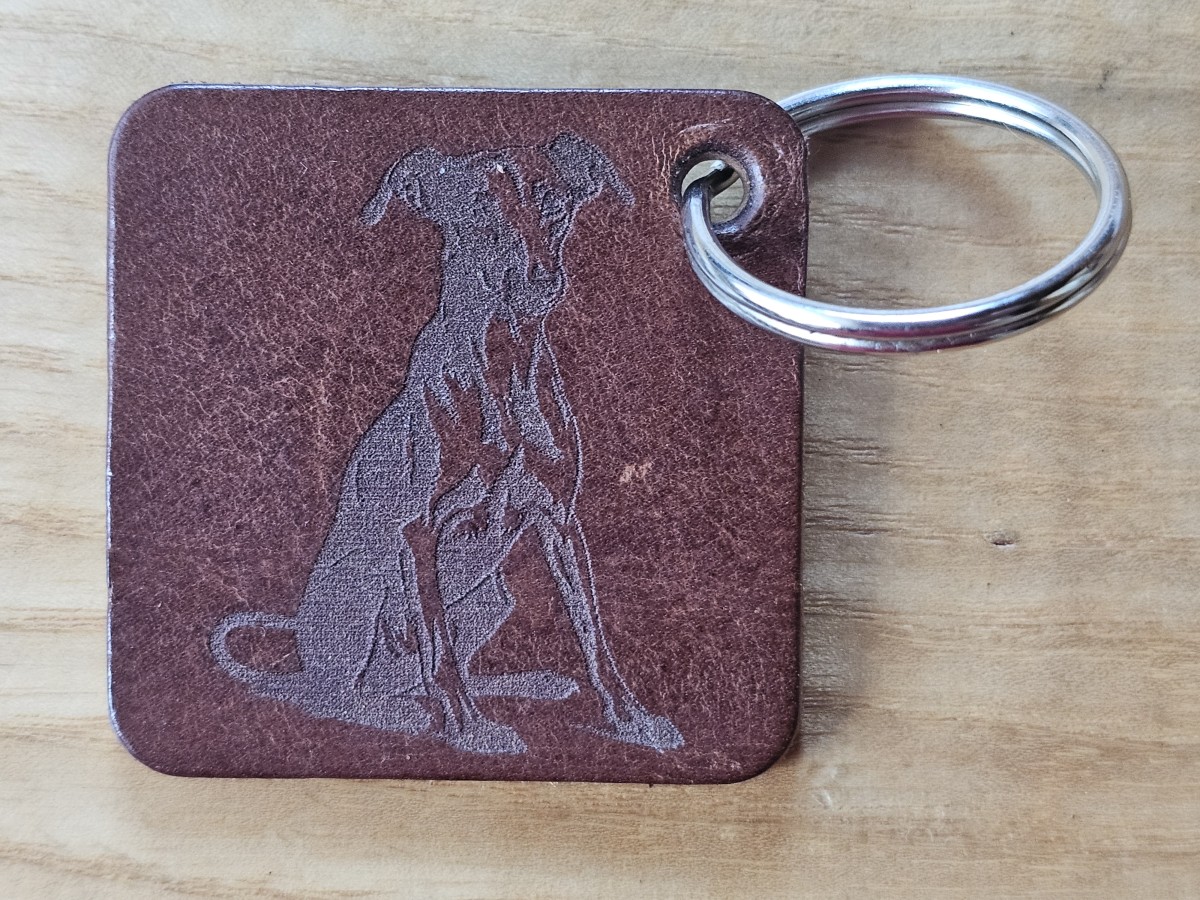 Pagamintas graviruotas raktų pakabukas iš  natūralios diržinės odos.