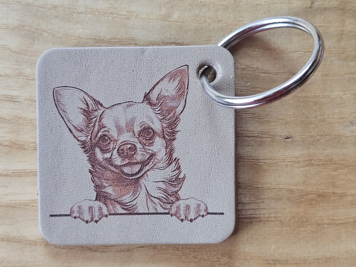 Pagamintas graviruotas raktų pakabukas iš šviesiai rudos natūralios diržinės odos.
