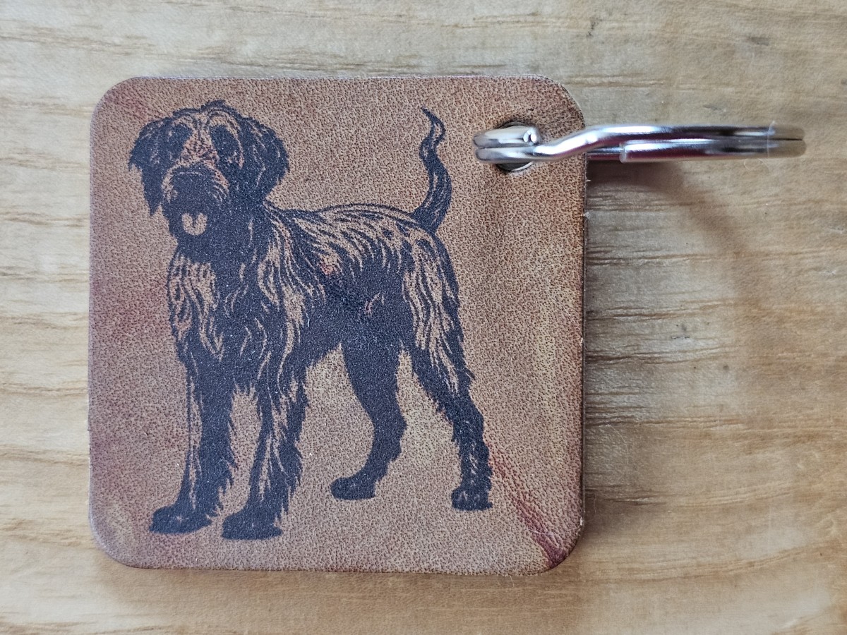Pagamintas graviruotas raktų pakabukas iš  natūralios diržinės odos.