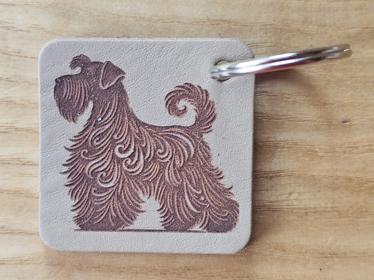 Pagamintas graviruotas raktų pakabukas iš šviesiai rudos natūralios diržinės odos.