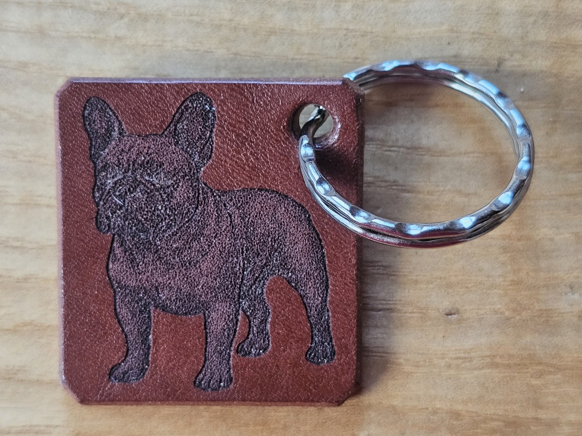 Pagamintas graviruotas raktų pakabukas iš  natūralios diržinės odos.