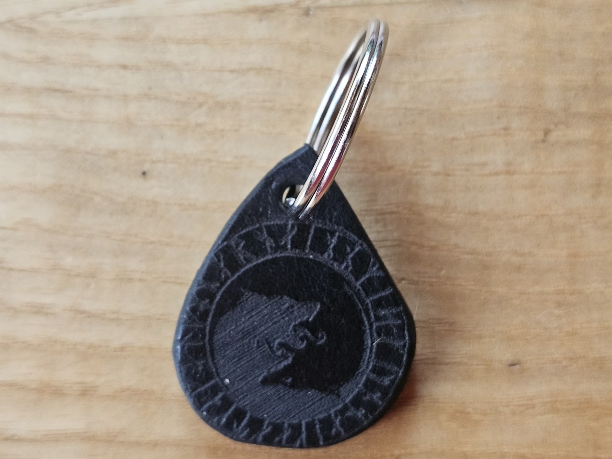 Pagamintas mažas graviruotas raktų pakabukas iš  natūralios diržinės odos.