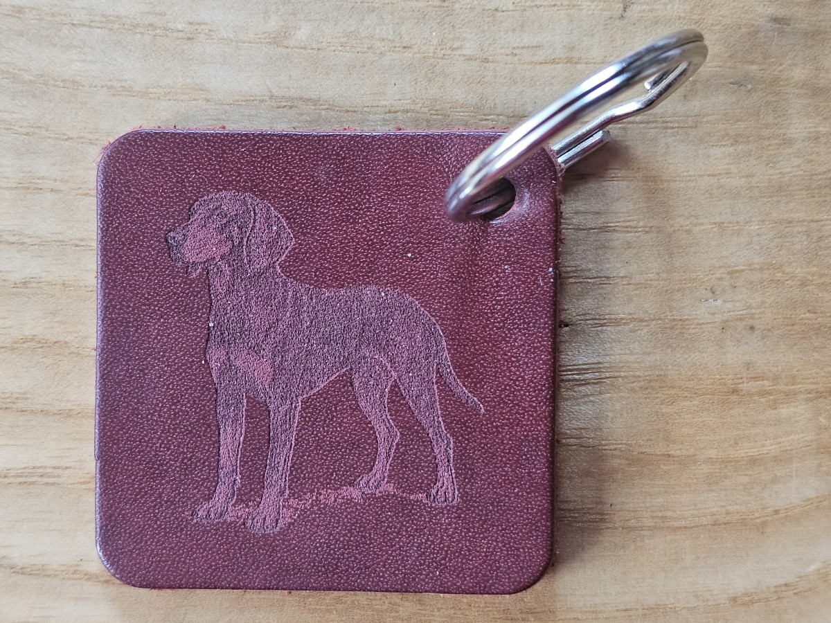 Stilingas ir ilgaamžis raktų pakabukas, pagamintas iš bordo spalvos natūralios diržinės odos. Išgraviruotas stovintis Lietuvių skalikas.