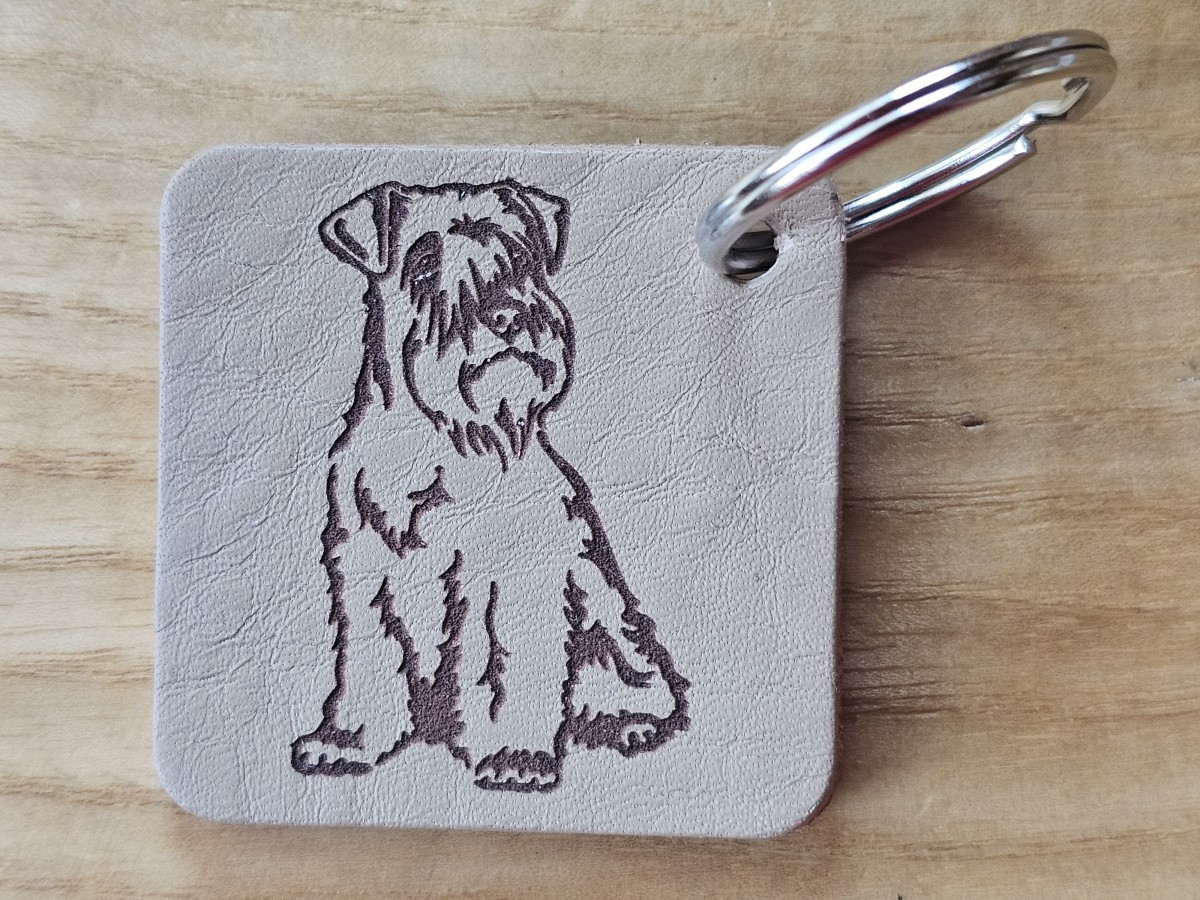 Pagamintas graviruotas raktų pakabukas iš šviesiai rudos natūralios diržinės odos.