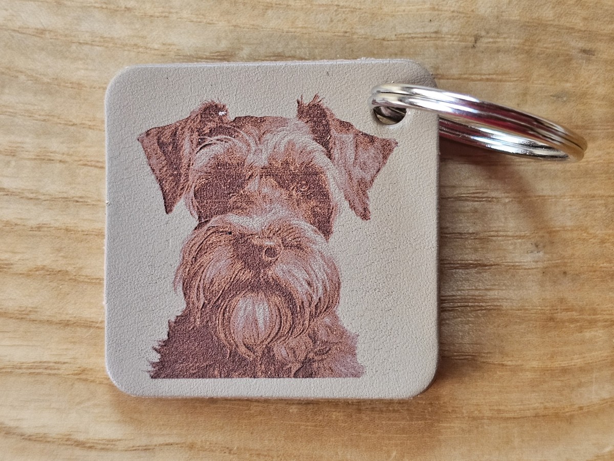 Pagamintas graviruotas raktų pakabukas iš šviesiai rudos natūralios diržinės odos.