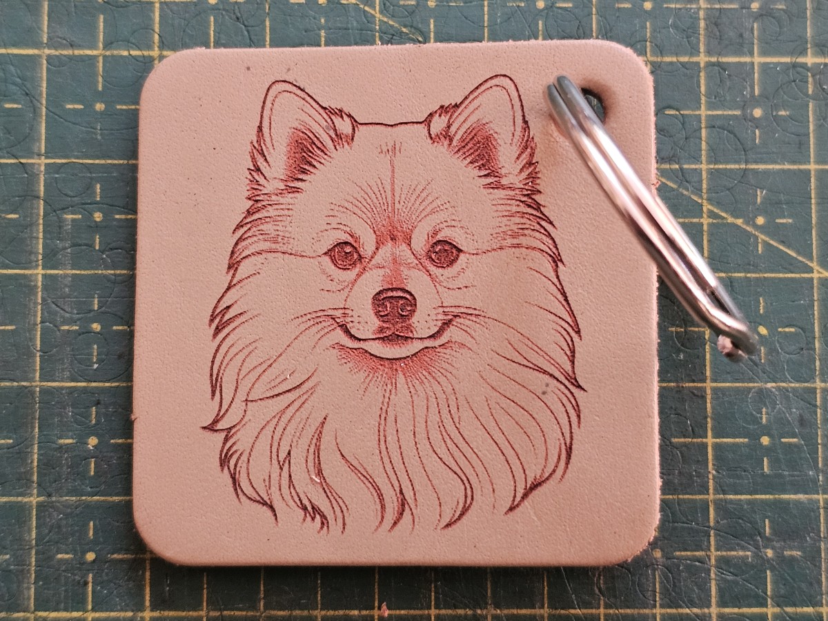 Pagamintas graviruotas raktų pakabukas iš šviesiai rudos natūralios diržinės odos.