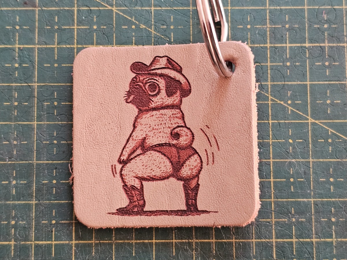 Pagamintas graviruotas raktų pakabukas iš šviesiai rudos natūralios diržinės odos.