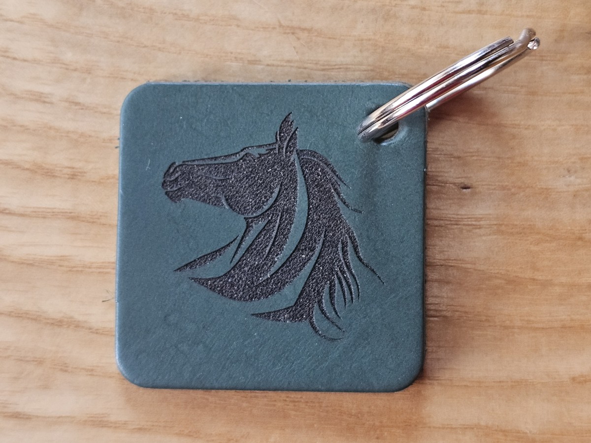 Pagamintas graviruotas raktų pakabukas iš žalios natūralios diržinės odos.