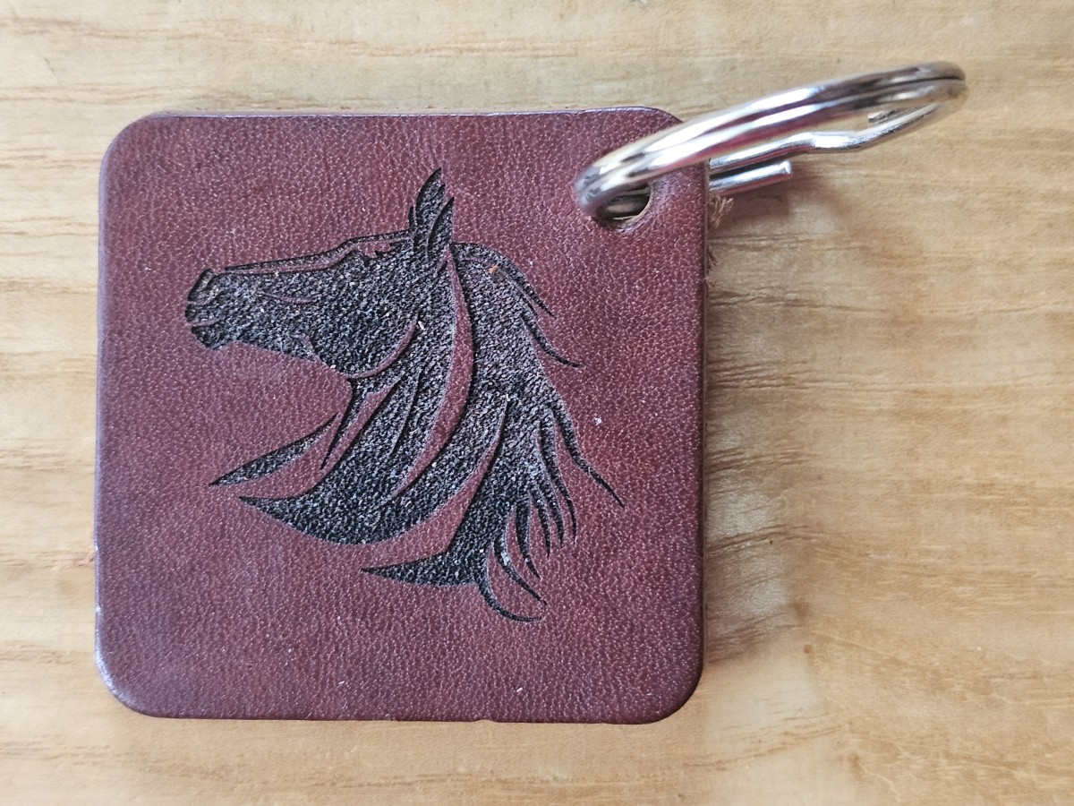 Stilingas ir ilgaamžis raktų pakabukas, pagamintas iš tamsios natūralios diržinės odos. Išgraviruota žirgo galva.