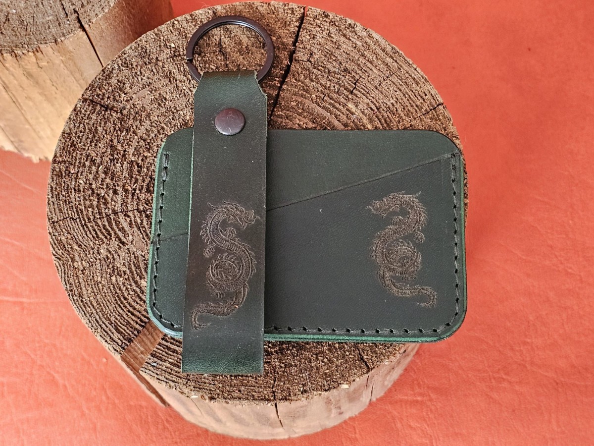 Riboto leidimo rinkinį sudaro natūralios odos horizontali sodriai žalios spalvos kortelinė (3 skyriai) ir raktų pakabukas su juoda tvirta furnitūra (stilingas žiedelis, kniedė). Ant abiejų gaminių graviruojamas 2024 metų simbolis – žalias drakonas.