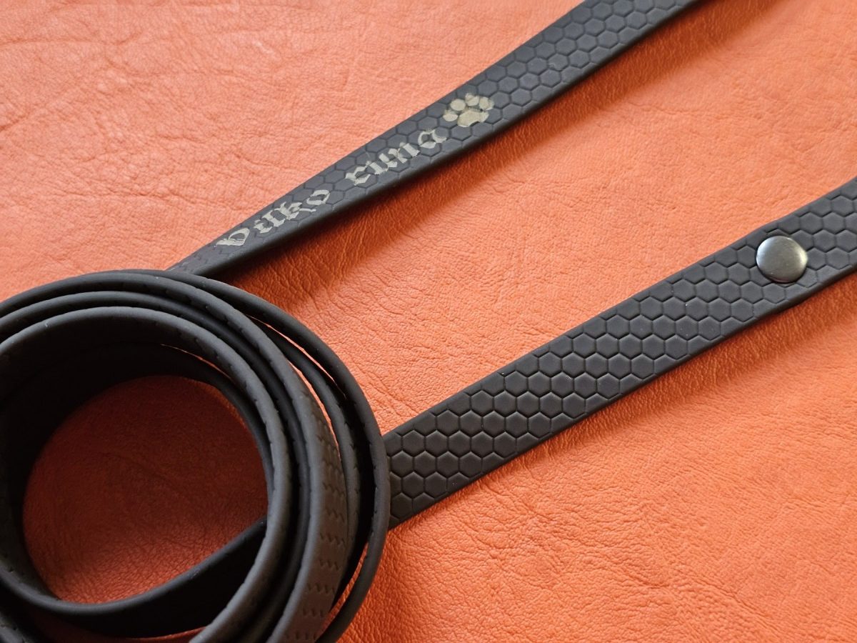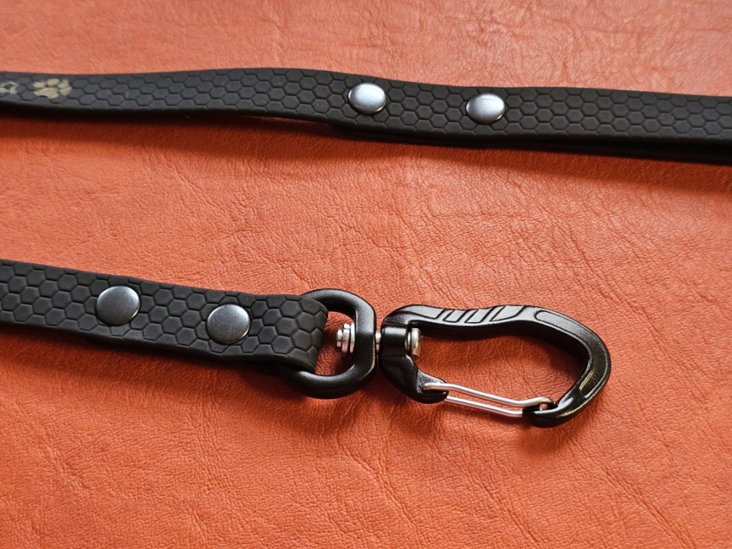 Karabinas atlaiko įvairių dydžių šunis, medžiaga rekomenduojama mažesniems/vidutinio didžio arba ramiems dideliems šunims.