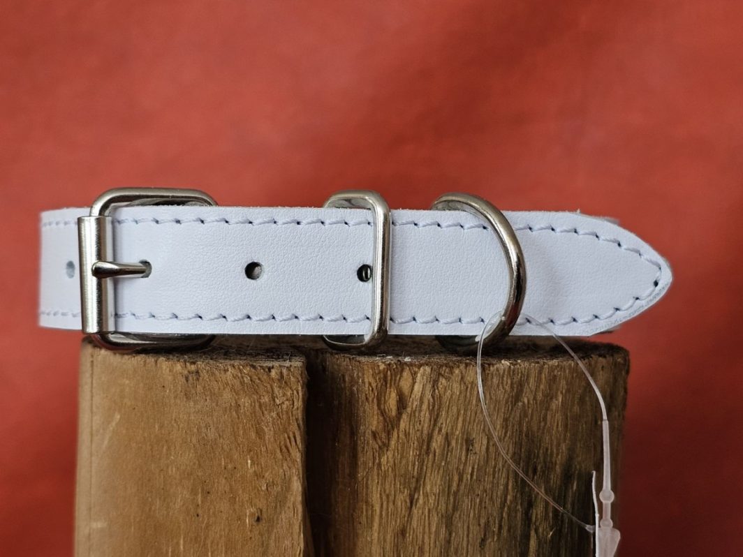 Natūralios odos minkštas baltos spalvos antkaklis. Pagamintas iš dviejų sluoksnių, naudota tvirta plieno furnitūra.