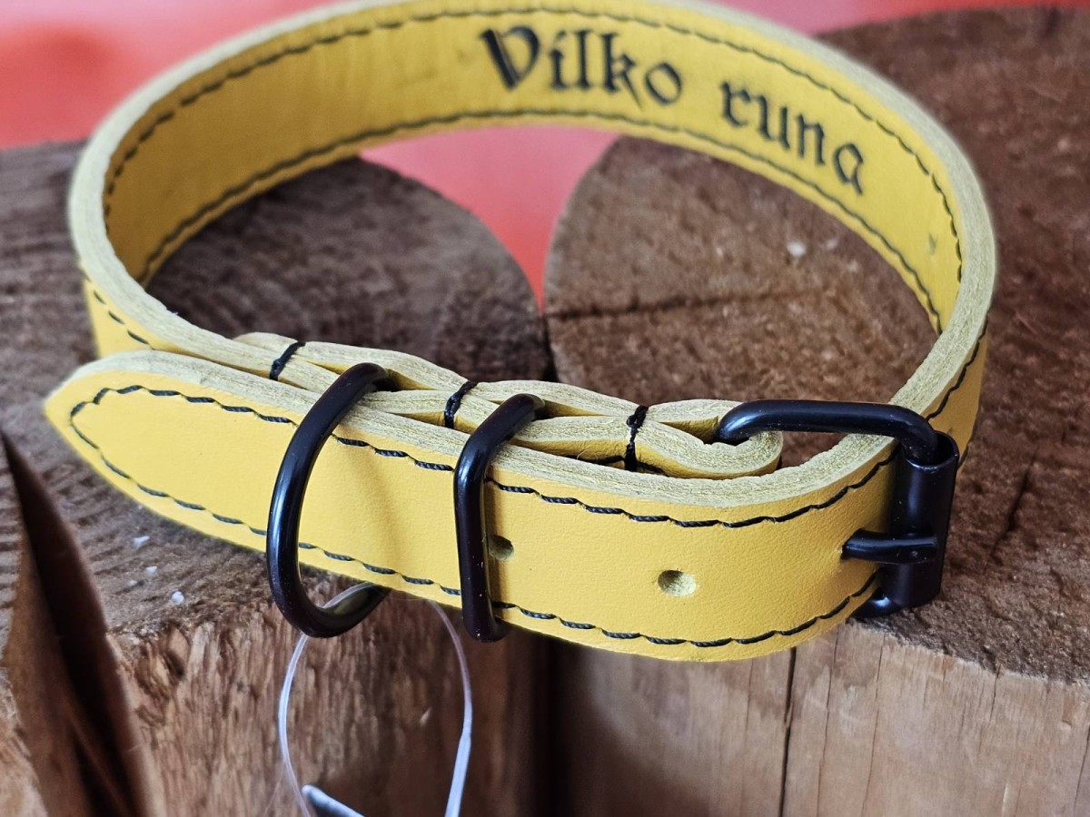 Natūralios odos minkštas ryškiai geltonas antkaklis. Pagamintas iš dviejų sluoksnių, naudota tvirta plieno furnitūra.